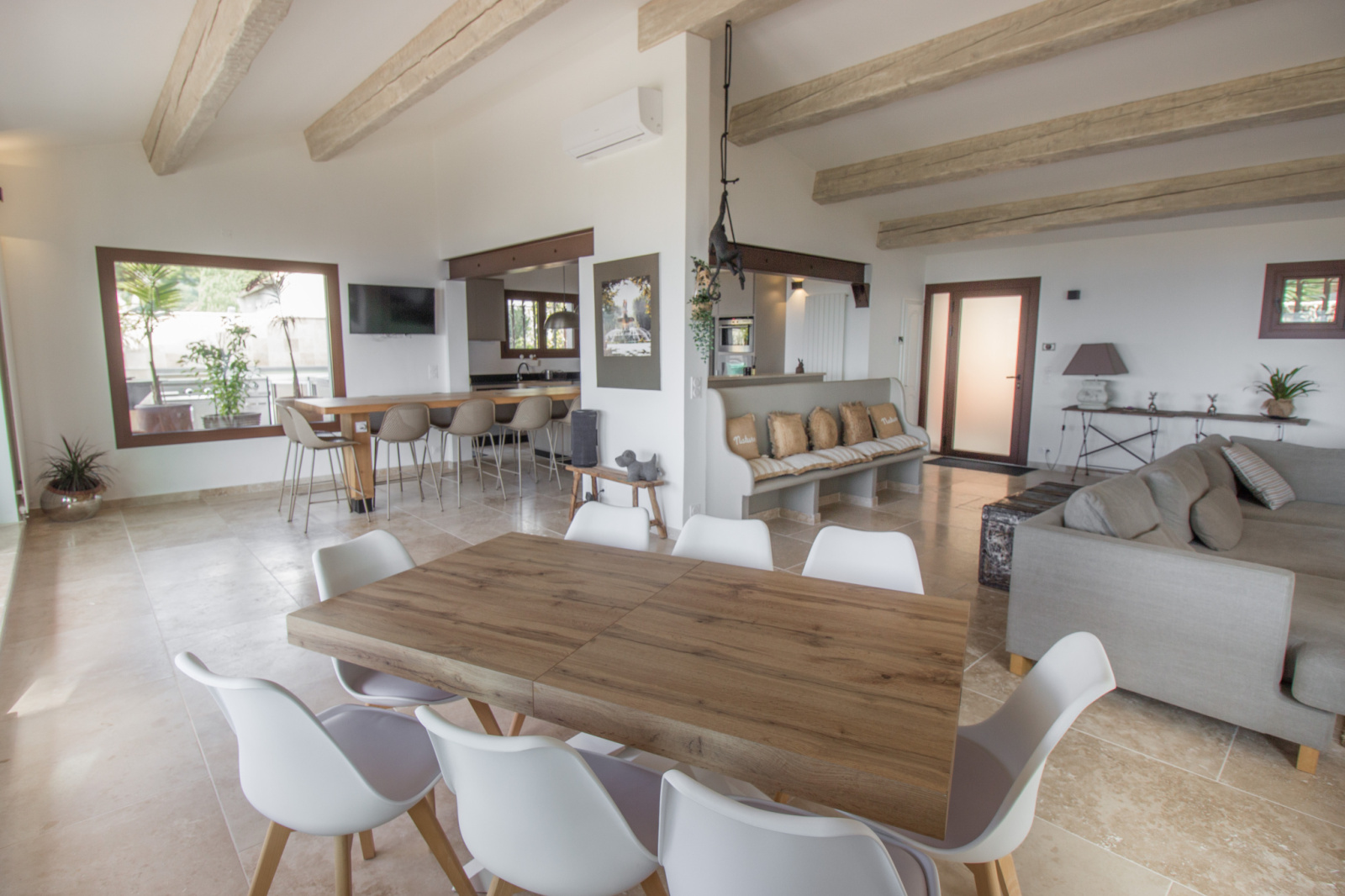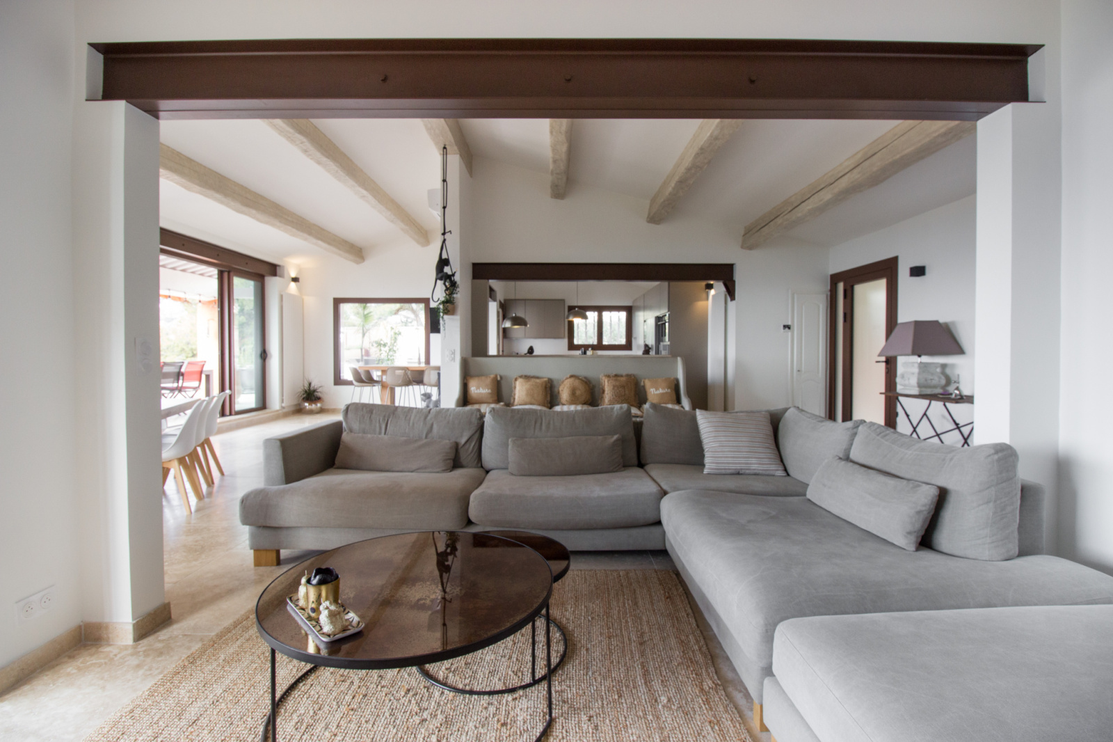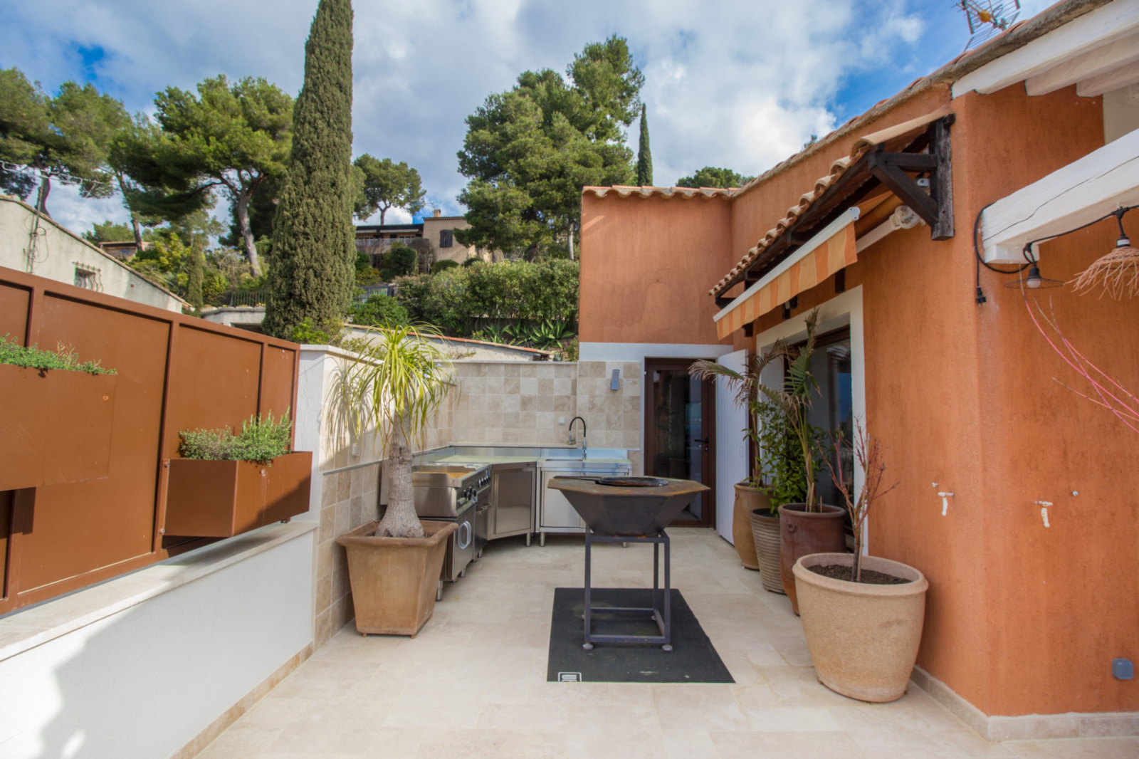 Dès l’entrée, volumes généreux et lumière naturelle séduisent. La pièce de vie de 100 m², avec cheminée et cuisine haut de gamme, s’ouvre sur une terrasse panoramique face à la Méditerranée.